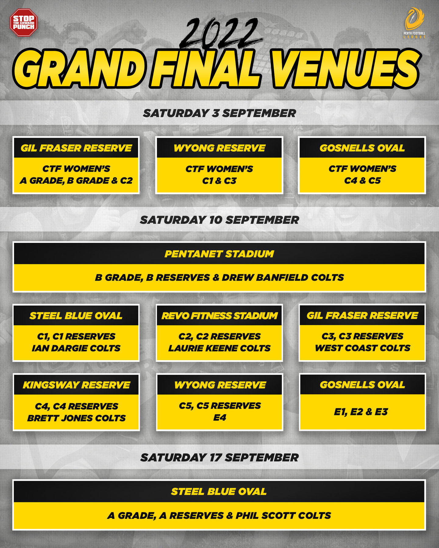 The Perth Football League is pleased to announce the 2022 Grand Final venues in the league’s biggest season yet with 31 Grand Finals to be played across three consecutive weekends.