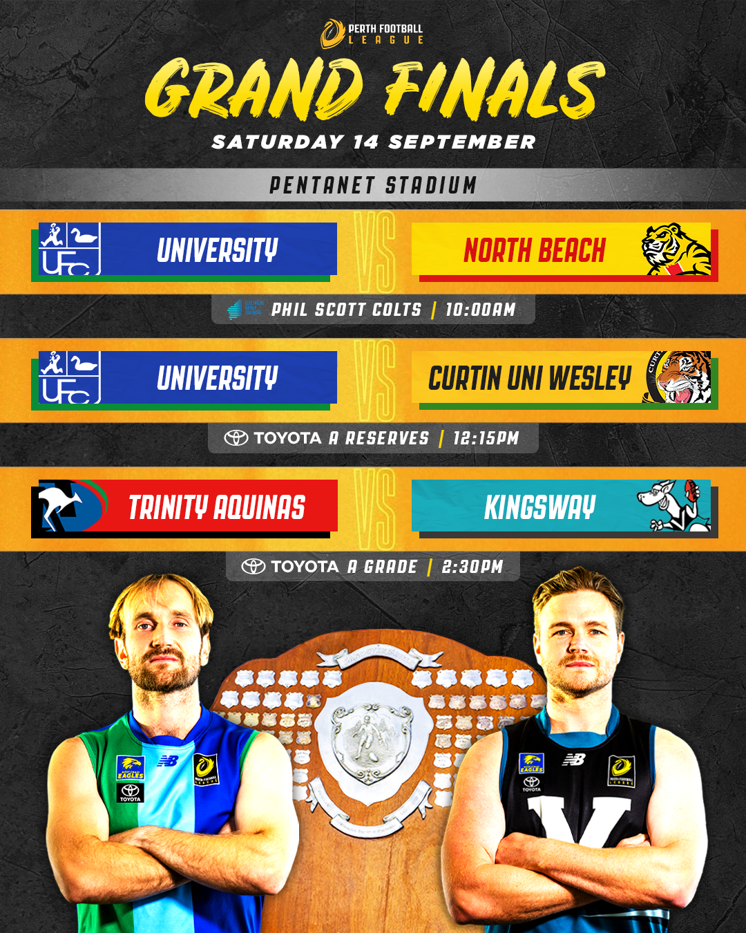 The main event will take place at 2:30pm with Trinity Aquinas coming up against Kingsway in the Toyota A Grade decider.