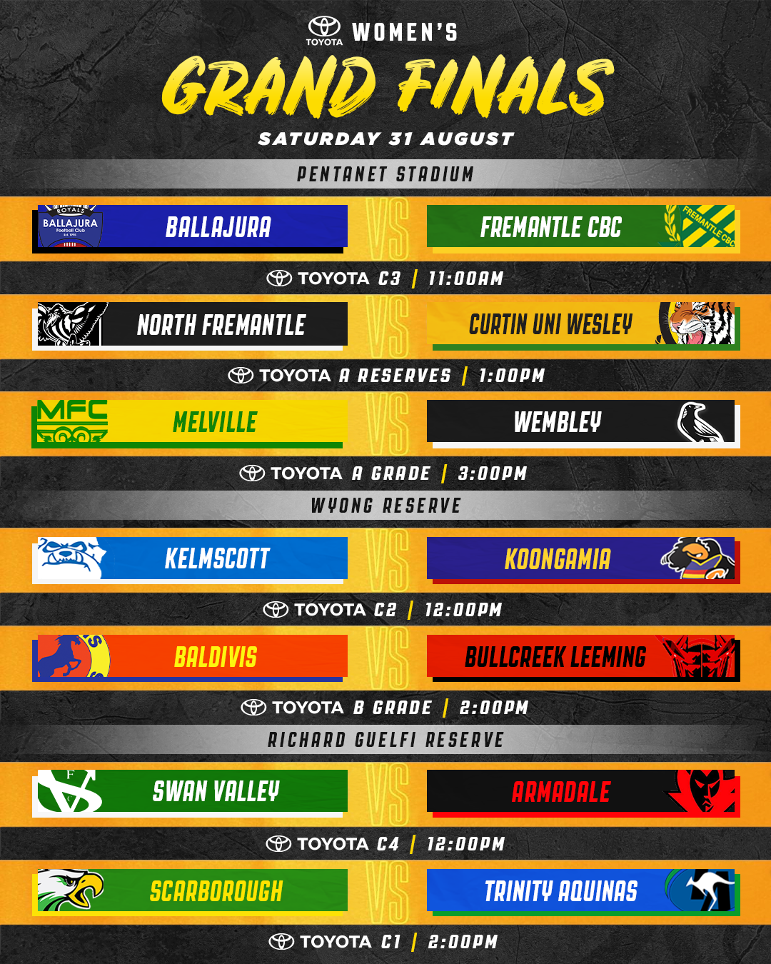 Wyong Reserve will host two Grand Finals with the undefeated Kelmscott going up against Koongamia in Toyota C2 at 12pm, followed by a repeat of last year’s C1 Grand Final with Baldivis taking on Bullcreek Leeming in the Toyota B Grade at 2pm.