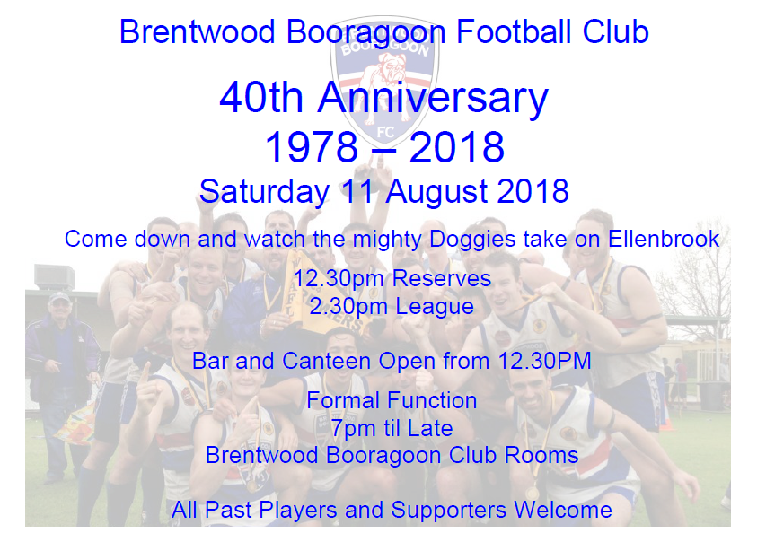 Brentwood Booragoon Football Club 40th Anniversary Reunion is on Saturday 11 August 2018 at Karoonda Oval, Booragoon.