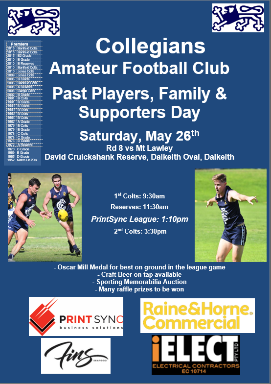 Collegians Past Players, Family and Supporters Day is on this Saturday 26 May at David Cruickshank Reserve, Dalkeith Oval, Dalkeith.