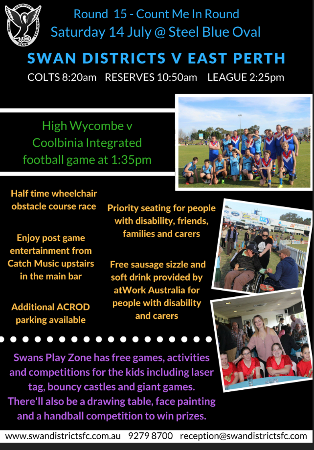 Swan Districts will have various activities at the ground on the day with a half time wheelchair obstacle course race, free sausage sizzle provided by atWork Australia for people with disabilities and their carers as well as additional ACROD parking available with priority seating for people with disabilities, friends, families and carers.