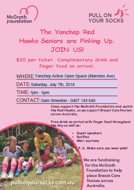 The Yanchep Red Hawks will be turning pink on Saturday 7 July to fundraise for the McGrath Foundation to help place Breast Care Nurses across Australia.