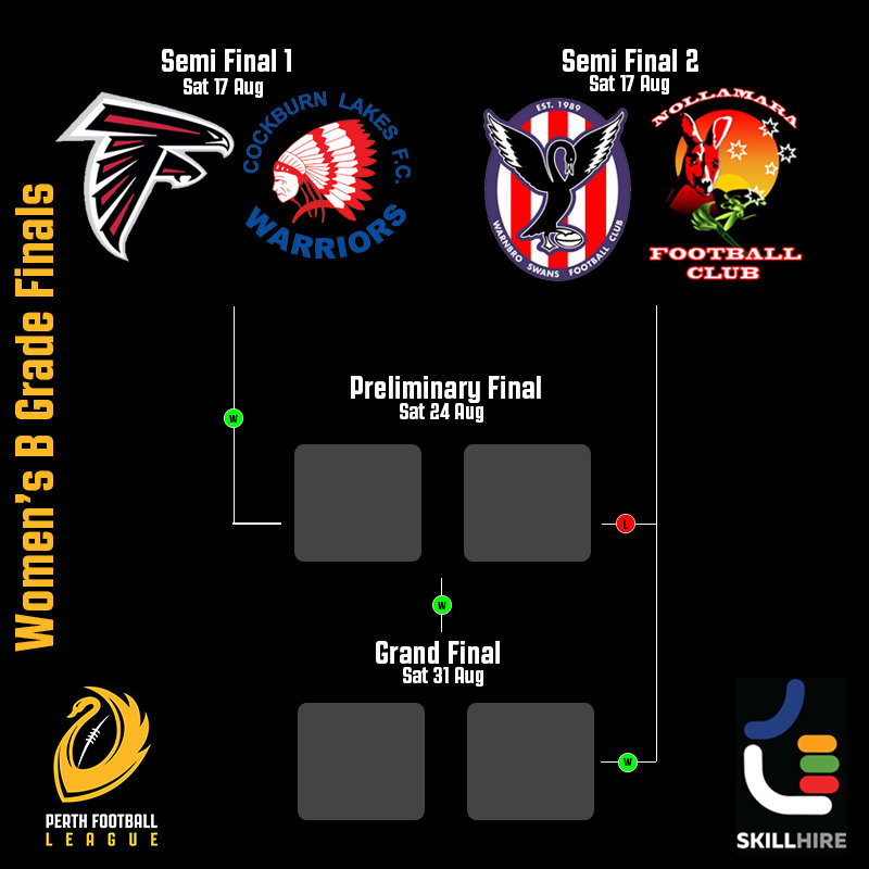 The B Grade competition sees undefeated minor premiers Warnbro Swans up against Nollamara in Semi Final 2. The match is set to be a close one with just five points and seven points separating the two sides in previous meetings this year.