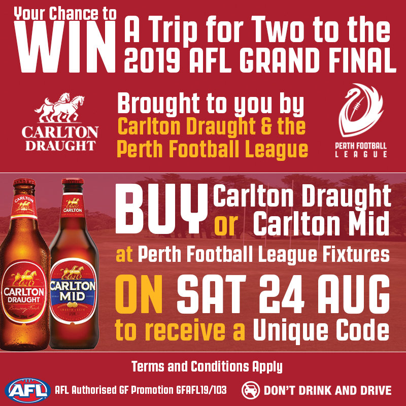 Buy a Carlton Draught or Carlton Mid on Saturday 24 August at any Perth Football League Fixture to receive a unique code.